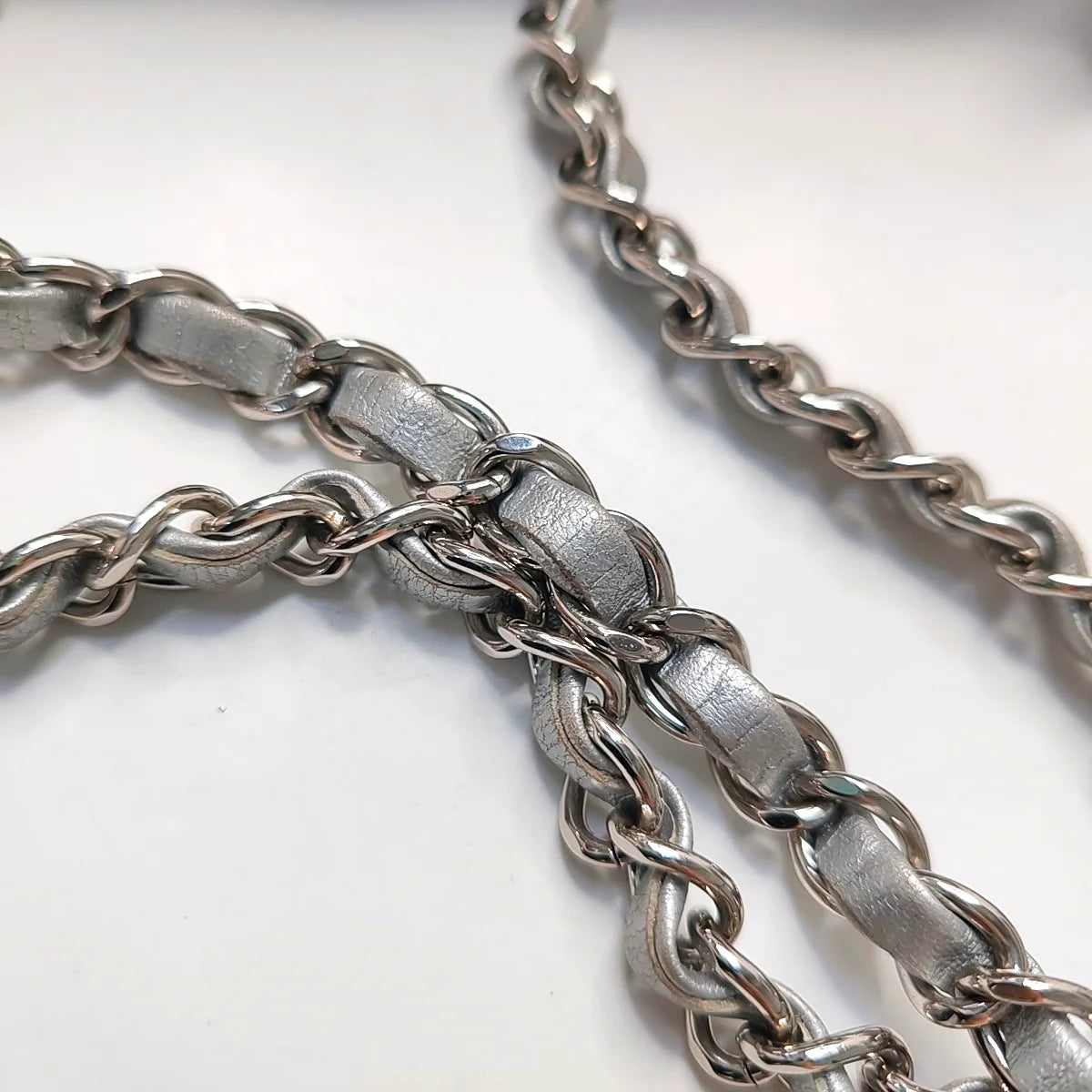 Seu interior em couro prateado e o estilo de dupla aba (Double Flap) refletem o equilíbrio entre luxo e funcionalidade, mantendo o charme atemporal da Chanel.