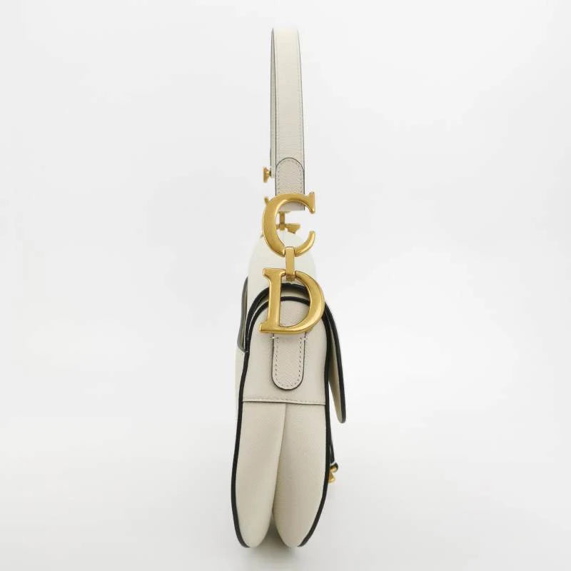 Este modelo de 2022 é confeccionado em couro de bezerro granulado branco, conhecido por sua resistência e textura sofisticada. A bolsa apresenta a clássica aba magnética em formato de sela, com o icônico logo “CD” em metal dourado envelhecido nas laterais da alça.