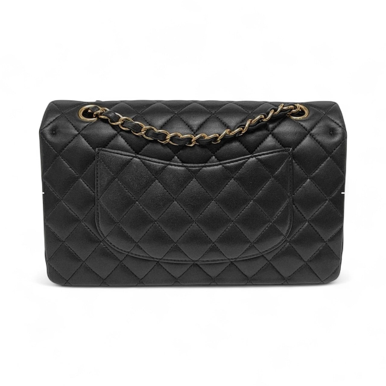 Bolsa Chanel Timeless Classic Flap em couro lambskin preto com ferragens douradas.